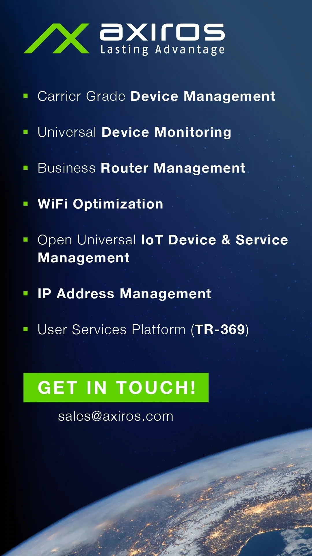 For over 20 years, Axiros has been a leading provider of software solutions for Device Management in telecommunications and other industries. The company's reputation for excellence and expertise in Device Management has made it a trusted partner for service providers and equipment manufacturers worldwide. Axiros specializes in offering Device Management software that enables seamless integration and management of devices and services, leveraging industry standards like TR-069 and USP. With a global presence, Axiros is committed to delivering innovative solutions that meet the evolving needs of businesses in today's digital landscape.
